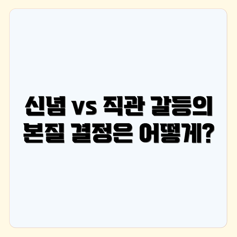 Q: 신념과 직관의 갈등을 해결하는 방법은 무엇인가요?A: 갈등을 해결하기 위해서는 먼저 각자의 신념과 직관을 명확히 인식하고, 상황에 따라 더 유리한 요소를 선택해야 합니다. 또한, 여러 관점을 고려해보고, 필요한 경우 전문가의 조언을 받는 것도 도움이 됩니다.